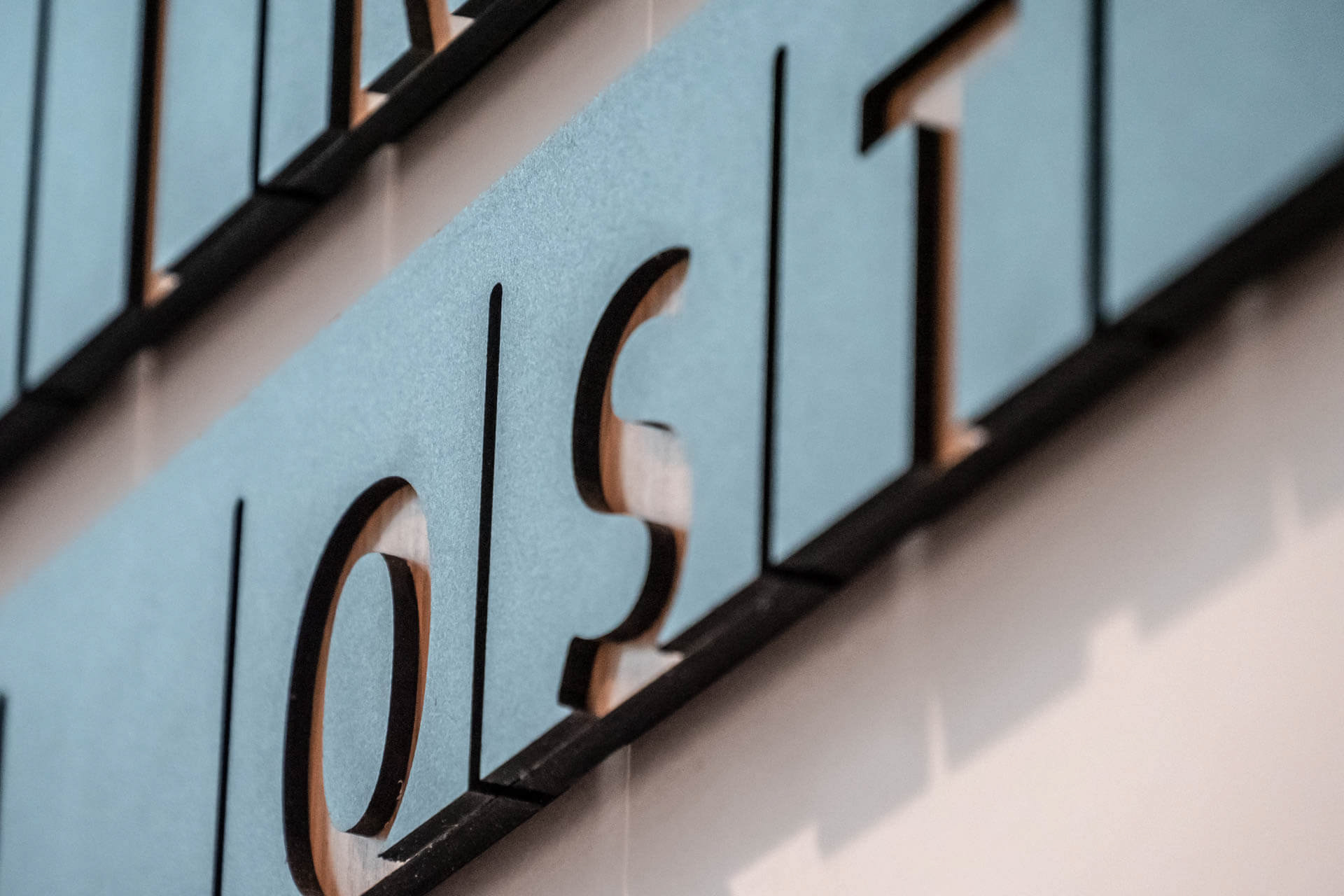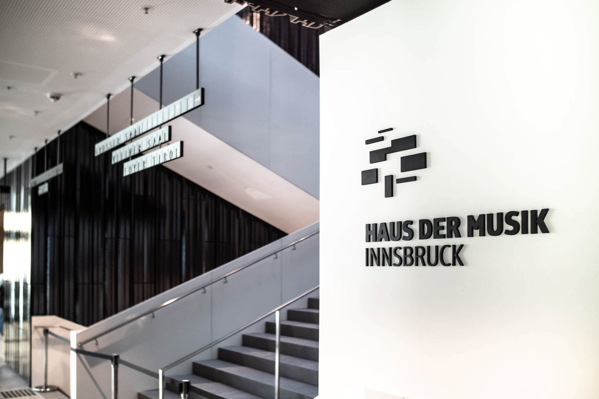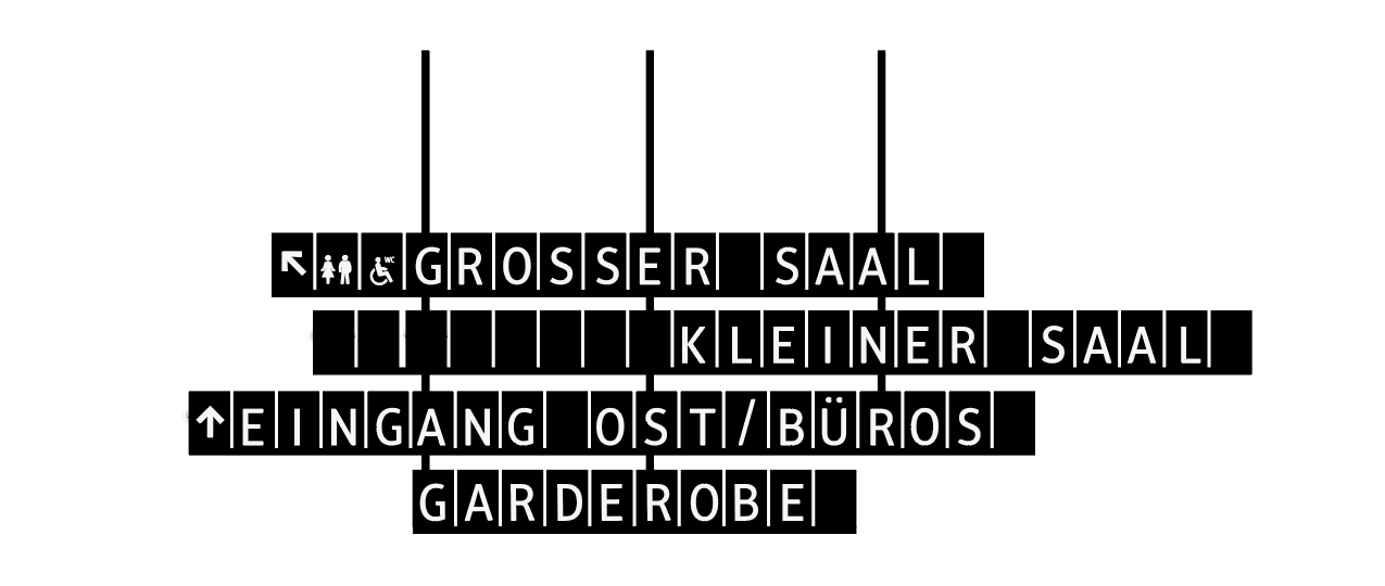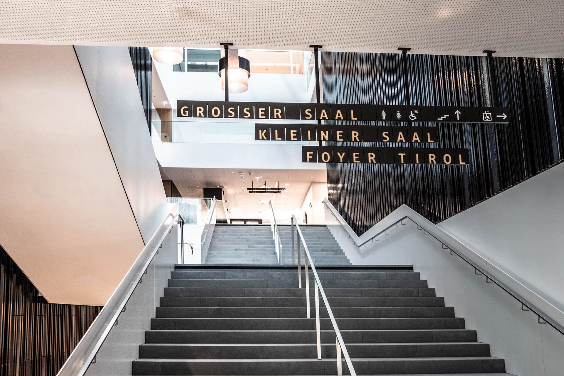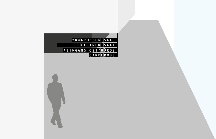 The fragmental logo and the architecture of the building served as the basis for the design of the guidance system. Thus, the way signs evoke color, shape, material and the lamella elements of the façade. Besides, widely spaced lettering captures the musical soundscape of the architecture. The guidance system harmonically complements the overall concept of the building.