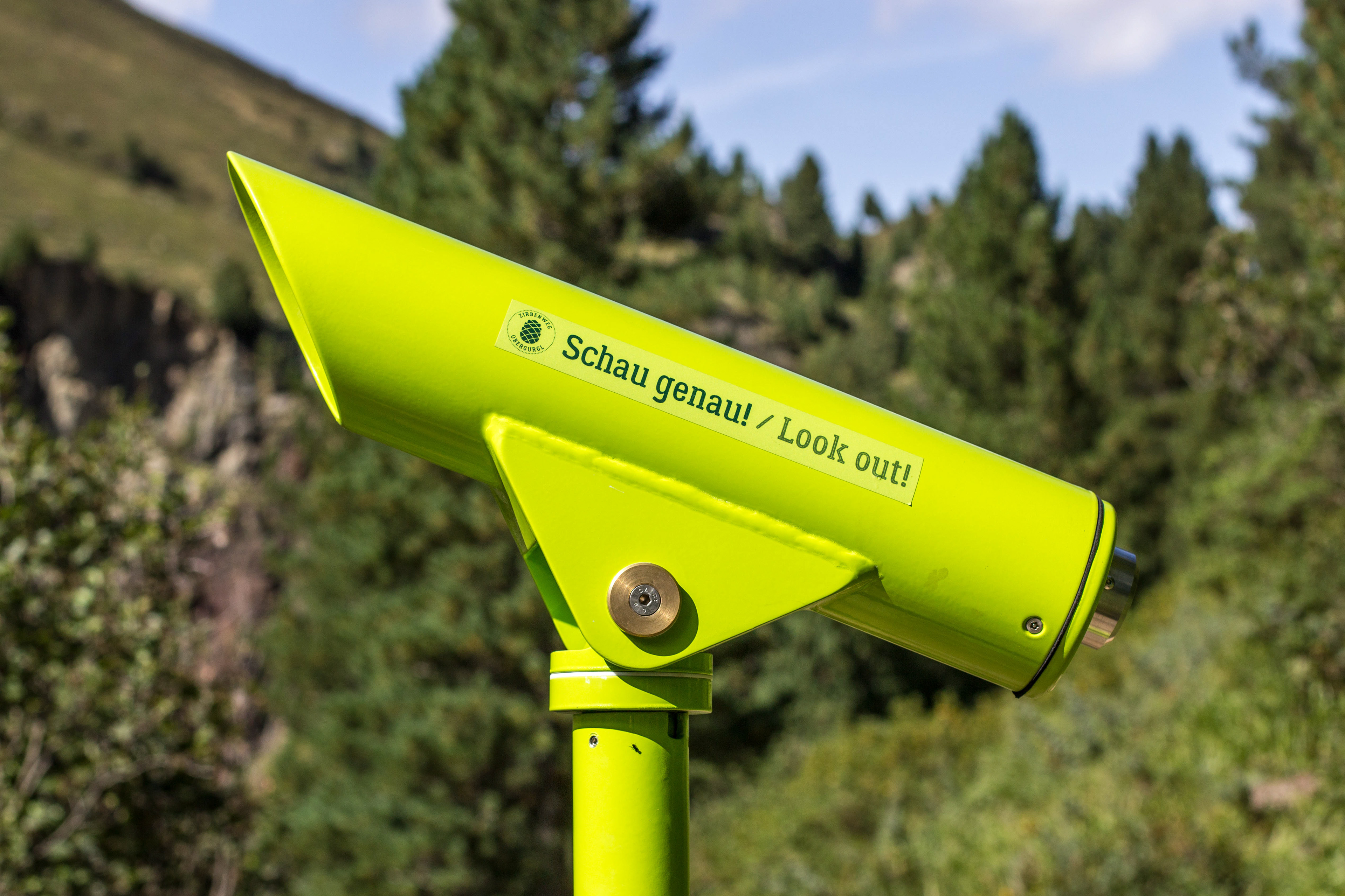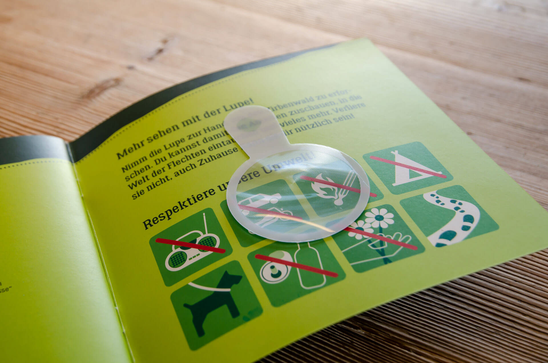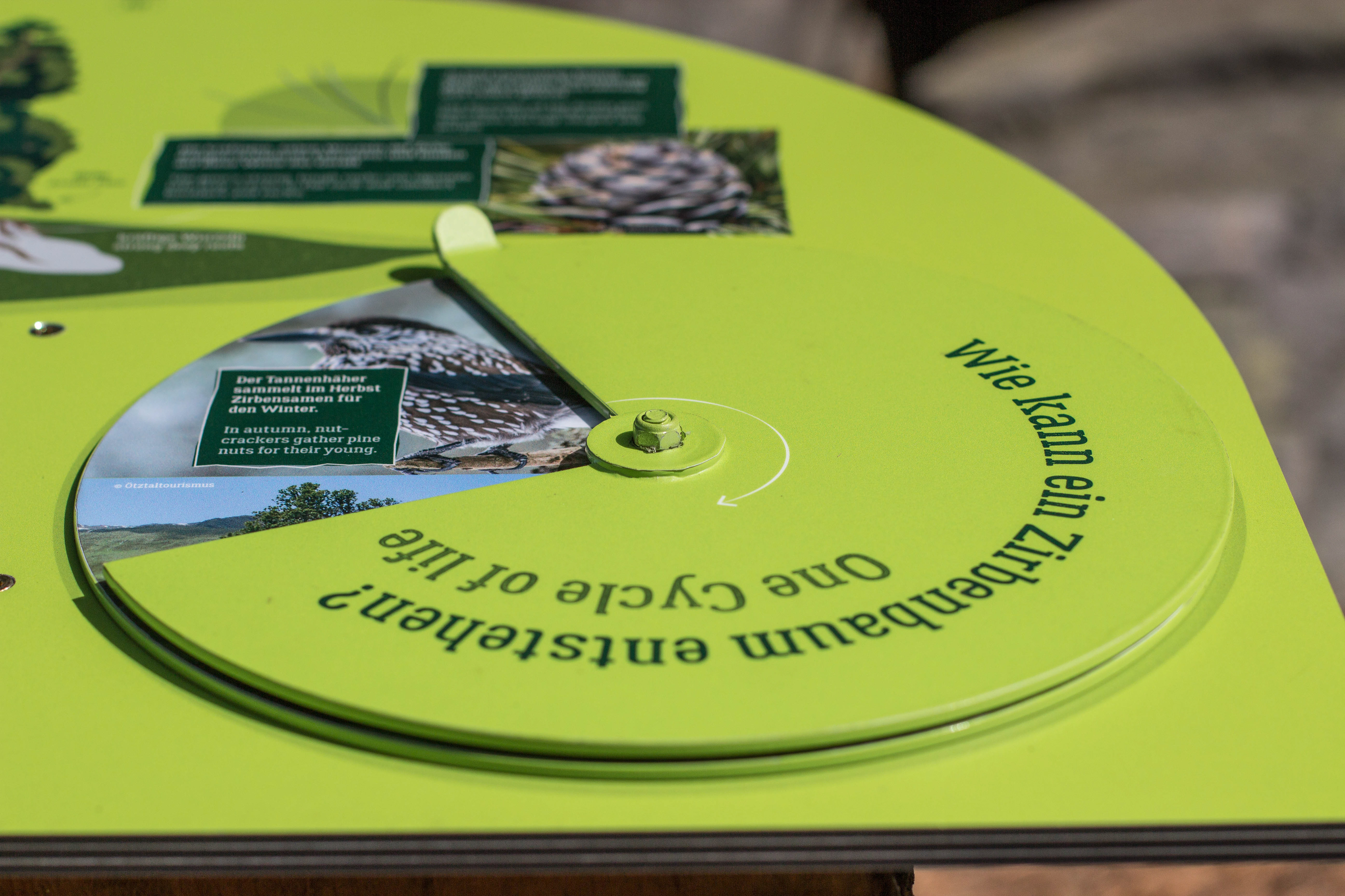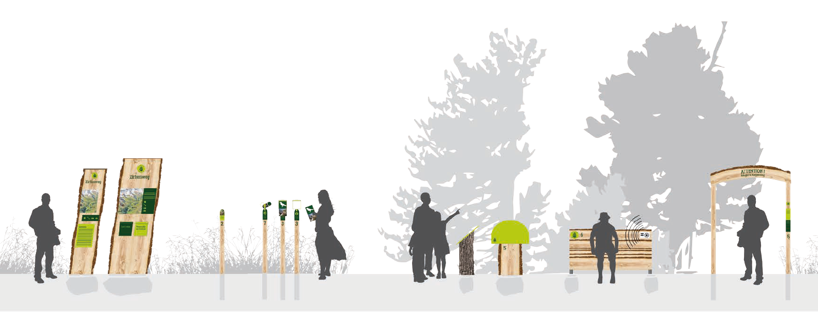 A story-line, tailored to the target group, is dedicated to the different themes of the Swiss stone pine forest. Sixteen stations are supervised by a playful print substrate. Accompanied tours of the nature park are also seen as part of the concept. In addition, a digital app concept with audio stories was developed but not implemented.